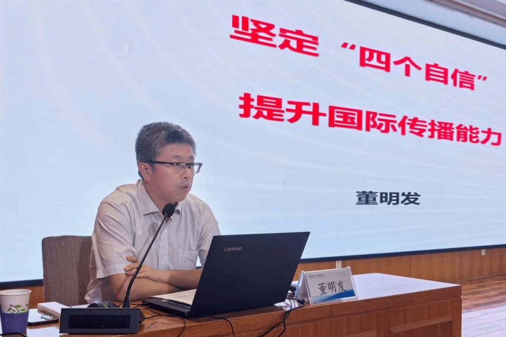 董明发以“坚定‘四个自信’,提升国际传播能力”为题,从“四个自信”的历史渊源和时代背景为切入点,系统梳理了其形成过程,并深刻阐释了“四个自信”的理论内涵与时代价值。他结合当前国际形势与我国对外传播实践,深入分析了提升国际传播能力的重要性和紧迫性,提出了以“四个自信”为精神内核,创新传播理念、构建话语体系、拓宽传播渠道、夯实人才基础的具体路径,为讲好中国故事、传播中国声音、展现可信可爱可敬的中国形象提供了坚实的理论支撑和实践指引。