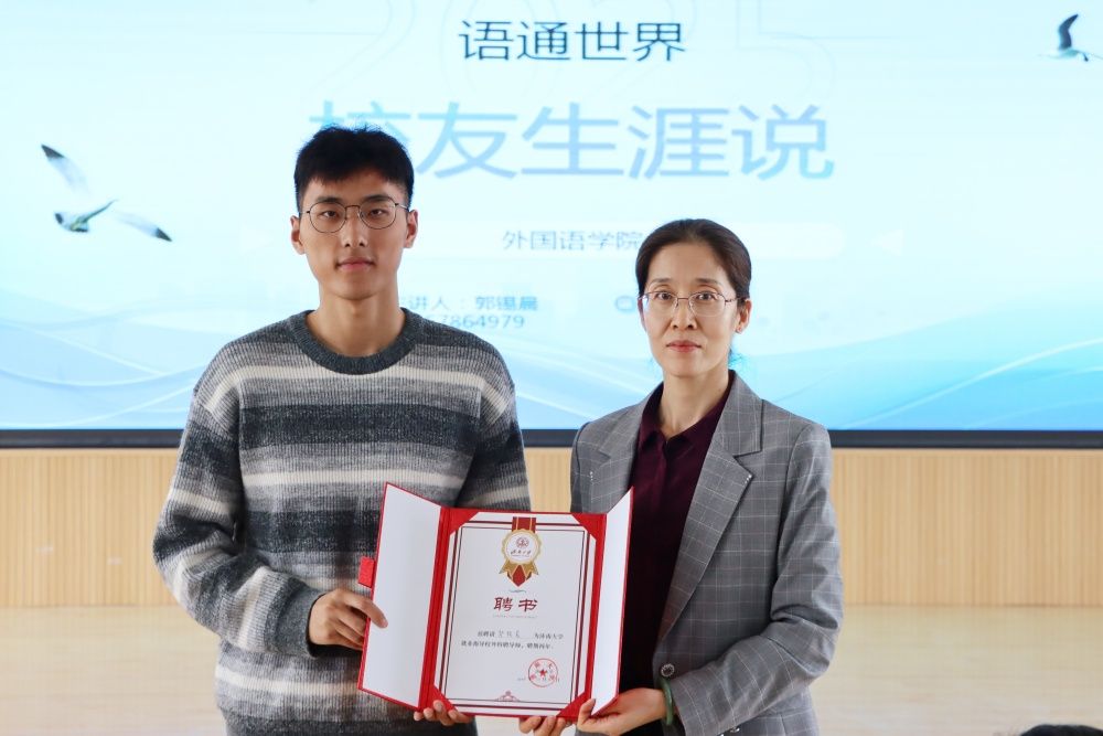 活动最后,郭英代表学院向郭锡晨颁发“济南大学就业指导校外特聘导师”聘书,鼓励他持续参与学院人才培养工作,为学生职业发展提供更多指导与支持。宋庆伟向郭锡晨校友在百忙中回到母校为同学们分享经验表示感谢,同时鼓励同学们要以优秀校友为榜样,坚定外语专业发展目标,勇敢追逐梦想,不断提升综合素质,努力成为有理想、有本领、有担当的新时代好青年。