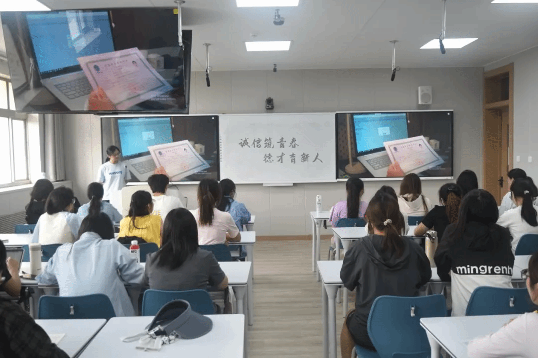 光影鉴诚,树立青春标尺。同学们共同观看了中国教育部教育考试院诚信主题教育短片《答卷人》,短片通过生动案例展现出不同身份的人在各自的“考场”上,坚守道德底线,认真书写自己的“答卷”,将“考试”诚信升华为个人品格塑造与社会责任担当的双重命题,引导同学们牢固树立诚信意识,自觉抵制学术不端、网络失德等行为。